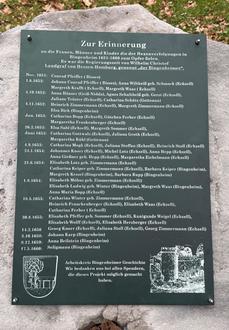 an die Frauen, Männer und Kinder die der Hexenverfolgungen in Bingenheim 1651 - 1660 zum Opfer fielen. Es war die Regierungszeit von Wilhelm Christof Landgraf von Hessen-Homburg, genannt "der Bingenheimer".