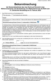 Bekanntmachung auf Recht auf Einsicht in das Wählerverzeichnis