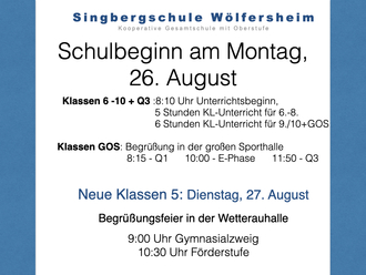 Am kommenden Montag, 26. August, beginnt der Unterricht an der Singbergschule für die Klassen 6-10 sowie der Q3 wie gewohnt um 8:10 Uhr.