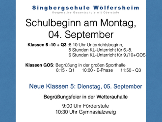 Am kommenden Montag, 04. September, beginnt der Unterricht an der Singbergschule für die Klassen 6-10 sowie der Q3 wie gewohnt um 8:10 Uhr.