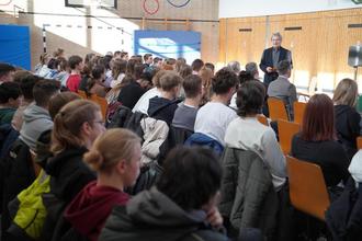 Eröffnet wurde die Veranstaltung von Schulleiter Olaf Bogusch, der dem Gast für sein Kommen dankte. Nach einem kurzen Grußwort des Bürgermeisters Eike See übernahmen Boguschs Stellvertreter Thorsten Rohde und Aufgabenfeldleiter Dr. Matthias Zipp, die die kurzweilige und lehrreiche Zeitzeugenbefragung moderierten. Neithard Dahlen, Mitglied des Auschwitz-Komitees und Mitorganisator, wendete sich in seiner Danksagung direkt an die Zuhörer: „Deshalb bitte ich Sie, wenn Sie Hetze und Hass hören: Seien Sie nicht gleichgültig! Erheben Sie Ihre Stimme! Sie haben doch etwas zu sagen! Häufig genügt es schon einfach zu sagen: “ Das will ich nicht! „“