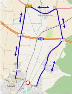 Die ausgeschilderte Umleitung führt auf der L 3188 zur B 455 nach Grund-Schwalheim und von dort abzweigend auf die K 183 über Bisses zurück nach Echzell. Die entgegengesetzte Fahrtrichtung ist analog beschildert.