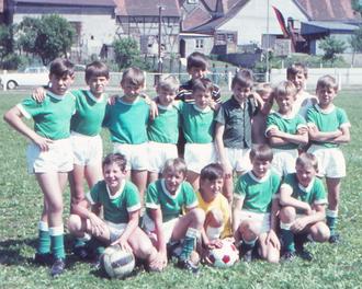 Die D-Jugend - 1971. Vorne von links: Harald Hofmann, Herwig Böcher, Hans-Hermann Stete, Peter Klein, Horst Winter. Hinten von links: Ralf Winter, Jürgen Magel, Walter Lohfink, Gerold Reuhl, Peter Rosenfeld, dahinter Armin Pipp, Reiner Lehr, (?), Horst Lohfink, Alfred Gunderloch und Rainer Mück.