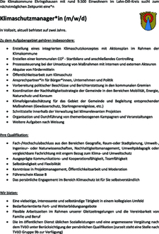 Die Klimakommune Ehringshausen mit rund 9.500 Einwohnern im Lahn-Dill-Kreis sucht zum nächstmöglichen Zeitpunkt eine*n