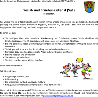 Bei der Gemeinde Ehringshausen ist ab sofort eine Stelle in Teilzeit (26 WoStd.) im