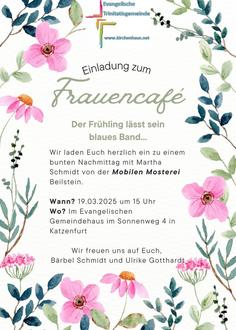 Am Mittwoch, den 19.03.2025 findet um 15:00 Uhr im Gemeindehaus in Katzenfurt das Frauencafé statt.