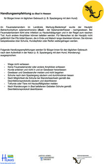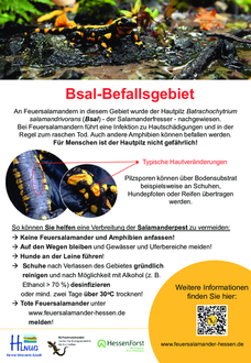 An Feuersalamandern im Landkreis Marburg-Biedenkopf wurde der Hautpilz Batrachochytrium salamandrivorans (Bsal) - der Salamanderfresser - nachgewiesen. Bei Feuersalamandern führt eine Infektion zu Hautschädigungen und in der Regel zum raschen Tod. Auch andere Amphibien können befallen werden. Für Menschen ist der Hautpilz nicht gefährlich! Der Pilz bildet Sporen, die in Erde und Matsch lange überleben können. Sie können beispielsweise über Schuhe, Hundepfoten oder Reifen weitergetragen werden.