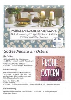 | 9.30 Uhr | Gottesdienst mit Taufen in der Jesus Christus-Kirche Dillheim (J. Paul) |