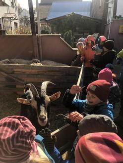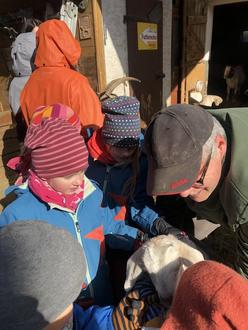 Frank Daniel und seine Familie begrüßten die Kinder sehr herzlich und nahmen sich viel Zeit um den Kindern ihre Ziegenlämmer, Schafe und Küken zu zeigen. Für die Waldmäuse war es sehr spannend zu sehen, wie die Ziegen und anderen Tiere im Winterquartier bei den Daniels leben und wie aktiv und außerordentlich süß die Lämmer und Küken sind. Die Ziegen konnten mit Brot und Heu gefüttert werden, Streicheleinheiten gab es von den Kindern und Betreuerinnen noch dazu. Auch die flauschigen Küken durften vorsichtig in die Hand genommen werden.
