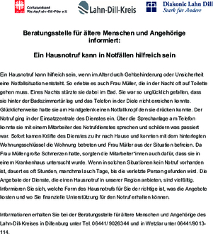 Informationen erhalten Sie bei der Beratungsstelle für ältere Menschen und Angehörige des Lahn-Dill-Kreises in Dillenburg unter Tel. 06441/ 9026344 und in Wetzlar unter 06441/9013-114.