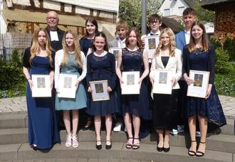 Luisa Cunz, Noah Joel Fritzjus, Johanna Löhr, Amelie Meier, Dana Reisinger, Jamie Reisinger, Leonard Rücker, Bastian Noah Schmidt, Lara Weber und Emilia Wild zusammen mit Pfarrer Ulrich Ries.
