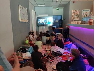 Nachdem alle ihre Bäuche mit den leckeren Waffeln gefüllt hatten, machte man es sich mit Decken, Isomatten, mitgebrachten Kuscheltieren und Popcorn gemütlich, um gemeinsam den Film „Die Schule der magischen Tiere 3“ zu schauen.