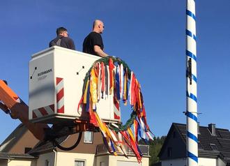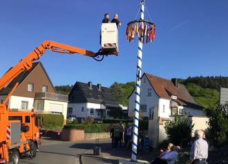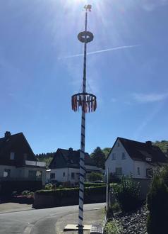 Pünktlich am letzten Abend vor dem 1. Mai kamen die Ichelhäuser an die Ecke Ichelhäuser Straße / Memelstraße zusammen und erlebten bei feierlicher Atmosphäre live, wie der bunt geschmückte Maikranz am blau-weißen Wappenbaum gen Himmel gehisst wurde. Der Maikranz war im letzten Jahr erstmals so in 12 Meter Höhe hängend über den Hausdächern Ichelhausens zu sehen, da der traditionelle Maibaum nach über 70-jähriger Tradition durch einen dauerhaft aufgestellten Vereinsbaum ersetzt wurde.