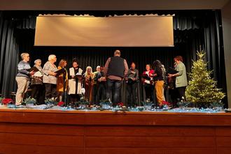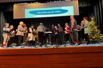 Der junge Chor „Stimmen 2001“ mit dem Dirigenten Steffen Beppler begeisterte nicht nur mit ihren wunderschönen Liedbeiträgen, sondern versorgten die Gäste mit den verschiedensten Getränken. Für eine Überraschung beim Chor und dem Dirigenten sorgte Wilfried Faber, als er das Weihnachtslied „Das Licht aus der Höhe“ von Siegfried Fitz mehrstimmig mit den Sängern einübte. Wilfried Faber sang das Solo, der Chor und die Gäste stimmten in den Refrain mit ein.