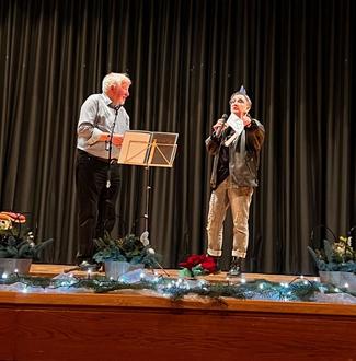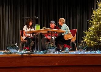 Nach einer Gesangseinlage: „Noel, Noel“, vorgetragen von Lisa Steffen und Wilfried Faber wurde die Rätseltante angekündigt. Verdutzte Gesichter, als ein „Punk“ die Bühne betrat und selbst Wilfried Faber kurz die Fassung verlor. Hinter der Maske verbarg sich Steffi Hubert. Sie gehört dem Redaktionsteam des Seniorenjournals an und hatte, wie auch in den Journalen, ein Weihnachtsrätsel für alle Gäste vorbereitet.
