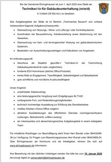 Bei der Gemeinde Ehringshausen ist zum 1. April 2025 eine Stelle als