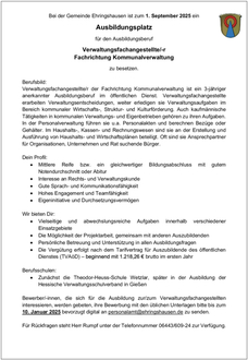 Bewerber/-innen, die sich für die Ausbildung zur/zum Verwaltungsfachangestellten interessieren, werden gebeten, ihre Bewerbung mit den üblichen Unterlagen bitte bis zum 10. Januar 2025 bevorzugt digital an personalamt@ehringshausen.de zu senden.