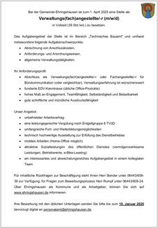 Bei der Gemeinde Ehringshausen ist zum 1. April 2025 eine Stelle als