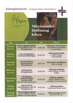 | 10.00 Uhr | Auftaktgottesdienst der Allianzgebetswoche 2025 im Gemeindehaus der Ev. Gesellschaft Ehringshausen, Nelkenweg |