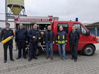 Von links: Valerian Ganus, Karsten Siegel (Brandschutzamt Ehringshausen), Lars Spitznagel (Gemeindebrandinspektor Hohenahr), Markus Ebertz (Bürgermeister Hohenahr), Jürgen Mock (Bürgermeister Ehringshausen), Steffen Zell (stellv. Gemeindebrandinspektor Ehringshausen)