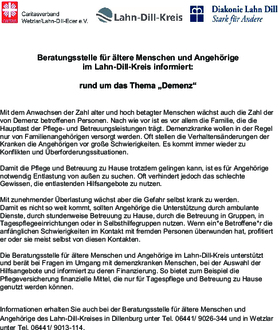 Die Beratungsstelle für ältere Menschen und Angehörige im Lahn-Dill-Kreis unterstützt und berät bei Fragen im Umgang mit demenzkranken Menschen, bei der Auswahl der Hilfsangebote und informiert zu deren Finanzierung. So bietet zum Beispiel die Pflegeversicherung finanzielle Mittel, die nur für Tagespflege und Betreuung zu Hause genutzt werden können.