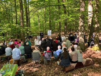 Im Anschluss an den Gottesdienst steht ein üppiges Kaffee und Küchenbuffet bereit, es wird gegessen und getrunken, sich unterhalten. Einige Interessenten scharen sich noch um Robert Mann, um Nachfragen zu seinem Vortrag zu stellen. Und wenn man sich umhört, ist das ungewöhnliche Gottesdienstformat ein voller Erfolg; „Der Wald hat so eine beruhigende Wirkung, es ist schön in diesem Umfeld Gottesdienst zu feiern“ sagt Gemeindereferentin Ellen Schneider. „Draußen Gottesdienst feiern kennt man ja, aber so richtig im Wald - ganz toll!“ findet eine weitere Besucherin.
