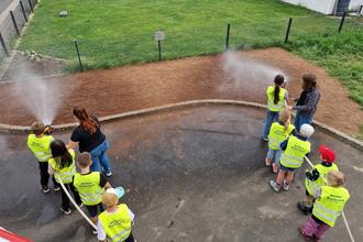 Mit einem Feuerwehrschlauch wurde die Blumenwiese gewässert.