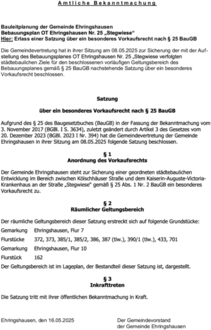 Die Gemeindevertretung hat in ihrer Sitzung am 08.05.2025 zur Sicherung der mit der Aufstellung des Bebauungsplanes OT Ehringshausen Nr. 25 „Stegwiese verfolgten städtebaulichen Ziele für den beschlossenen vorläufigen Geltungsbereich des Bebauungsplanes gemäß § 25 BauGB nachstehende Satzung über ein besonderes Vorkaufsrecht beschlossen.