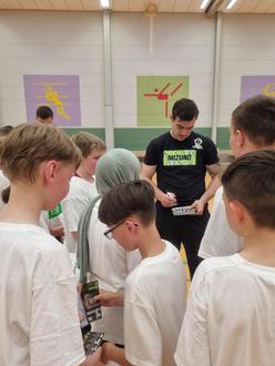 Im Rahmen der AOK-Schultour hatten die Schülerinnen und Schüler der Klasse 6e der Johannes-Gutenberg-Schule die einmalige Gelegenheit, zwei echte Handballprofis von der HSG Wetzlar persönlich zu treffen und kennenzulernen. Mit neuen Trainings-Shirts ausgestattet, erhielten sie gleich zu Beginn von Torhüter Anadin Suljakovic und Rückraumspieler Jovica Nikolic eine Einführung in die Grundlagen des Handballsports. Dabei standen neben technischen Finessen auch Koordinations- und Torwurfübungen auf dem umfangreichen Sportprogramm. Nach Ende des Trainings gaben die beiden Bundesligaprofis und Nationalspieler geduldig Autogramme und waren für jedes Foto zu haben. Sie nahmen sich zudem viel Zeit, die zahlreichen Fragen rund um das Leben als Profi zu beantworten. "Die Kids und die Profis haben fantastisch zusammengearbeitet", berichtet Sportlehrer Nicolai Göbel begeistert, „Es war eine rundum gelungene Aktion". Die tollen Eindrücke des Tages wurden von Klassenlehrerin Nadine Neubauer mit vielen Fotos und Videos festgehalten. "Dank ihrer entspannten und unkomplizierten Art nahmen die beiden Spieler den Kindern und Jugendlichen von Anfang an die Nervosität und sorgten für ein unvergessliches Sporterlebnis", resümierte die Klassenlehrerin abschließend die Veranstaltung.