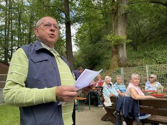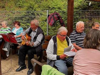 Gerhard Karl vom Heimatverein Katzenfurt erzählte den interessierten Gästen zu Beginn etwas über die Geschichte des Nutria-Häuschens. Die musikalische Leitung lag wieder in den bewährten Händen von Wilfried Faber, der ein buntes Programm mit beliebten und bekannten Volks- und Wanderliedern zusammengestellt hatte und den Gesang zwischendurch mit Anekdoten, Gedichten und Histörchen würzte. Vor allem seine Erzählungen und Gedichte über seine Jugend faszinierten die Besucher.