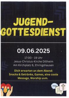 | 17.00 Uhr | Jugendgottesdienst in der Jesus Christus-Kirche Dillheim (JuGo-Team) |
