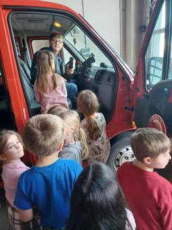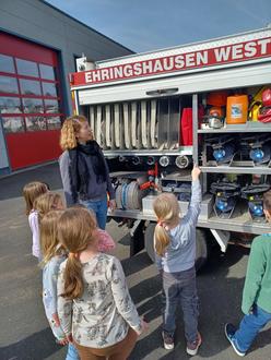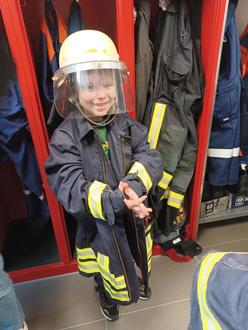 Dort wurden den Kindern von Mareike und Simon alles geduldig gezeigt und erklärt. Es wurde getestet wie schwer eine Einsatzjacke ist und wie man mit einem Schutzhelm aussieht. Die Einsatzfahrzeuge waren natürlich das Highlight des Ausfluges, darin zu sitzen war für unsere Kinder sehr aufregend.