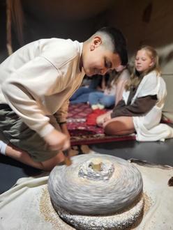 Gleich zu Beginn der Gruppenführung tauchten die Schülerinnen und Schüler in die Zeit des Alten Testaments ein und erfuhren dabei, wie die Menschen damals als Nomaden in Zelten lebten und welche Bedeutung Gastfreundschaft in ihrem Alltag hatte. In einem nachgebauten Nomadenzelt hörten sie die Geschichte von Abraham und konnten durch das Mahlen von Korn an einem Mahlstein oder das Riechen von Ölen und Gewürzen die damalige Lebenswelt nachempfinden. Wiederholt kam es zu spontanen Fragen der Lernenden u.a. mit dem immer wieder auftauchenden Gedankengang „Was hat das eigentlich mit mir zu tun?“ Und diese Frage zog sich dann auch wie ein roter Faden durch den gesamten Besuch und ermöglichte eine tiefere Verbindung zu den biblischen Geschichten herzustellen.