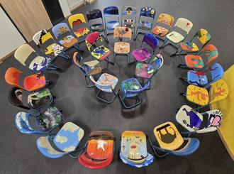 Im Zuge der Renovierung des Hauptgebäudes der Schule erhielten alle Unterrichtsräume im ersten und zweiten Stockwerk neue Tische und neue Stühle. Diese seltene Gelegenheit nutzte Kunstlehrer Hammann für ein Aktion in seinem Kunstkurs. Die alten und aussortierten Stühle wurden kurzerhand zu Leinwänden umfunktioniert.
