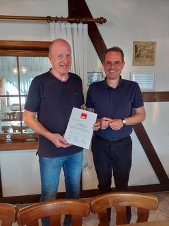 Horst Clößner hat bei der letzten Wahl des Ehringshäuser SPD-Vorstands nicht mehr kandidiert. Nach alles in allem wohl mehr als 20 Jahren als Beisitzer dankte der Ehringshäuser SPD-Vorsitzende David Rauber für den Vorstand dem Katzenfurter jetzt für seine zuverlässige und gute Mitarbeit mit einer Urkunde und einem Präsent. Horst bleibt der Kommunalpolitik allerdings als Beigeordneter im Gemeindevorstand erhalten und ist zum Glück auch sonst vielfältig aktiv.