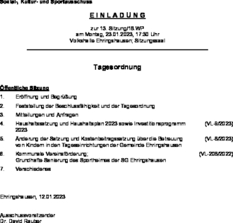 - Änderung der Satzung und Kostenbeitragssatzung über die Betreuung (VL-8/2023) von Kindern in den Tageseinrichtungen der Gemeinde Ehringshausen