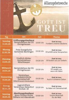 | 10.00 Uhr | Abschlussgottesdienst der Allianzgebetswoche 2026 mit Abendmahl und dem CVJM Posaunenchor Ehringshausen in der Jesus Christus-Kirche Dillheim (W. Faber, J. Paul) |