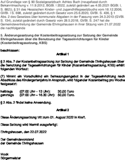 Auf Grundlage von § 90 Sozialgesetzbuch Achtes Buch (neugefasst durch Bekanntmachung v. 11.9.2012, BGBl. I 2022, zuletzt geändert am 4.05.2021 BGBl. I, S. 882)), § 31 des Hessischen Kinder- und Jugendhilfegesetzbuchs vom 18.12.2006, GVBl. I S. 698, zuletzt geändert durch Gesetz vom 25.6.2020, GVBl. S. 436, § 1 Abs. 2 des Gesetzes über kommunale Abgaben in der Fassung vom 24.3.2013 (GVBl. S. 134), zuletzt geändert durch Gesetz vom 28.5.2018, GVBl. S. 247 hat die Gemeindevertretung der Gemeinde Ehringshausen in ihrer Sitzung vom 21.07.2022 die nachfolgende