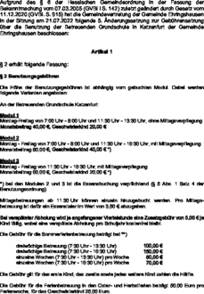 Aufgrund des § 6 der Hessischen Gemeindeordnung in der Fassung der Bekanntmachung vom 07.03.2005 (GVBl I S. 142) zuletzt geändert durch Gesetz vom 11.12.2020 (GVBl. S. 915) hat die Gemeindevertretung der Gemeinde Ehringshausen in der Sitzung am 21.07.2022 folgende 5. Änderungssatzung zur Gebührensatzung über die Benutzung der Betreuenden Grundschule in Katzenfurt der Gemeinde Ehringshausen beschlossen: