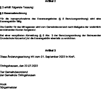 Die Gebühr für das Mittagessen wird vom Gemeindevorstand nach Maßgabe der tatsächlich entstehenden Kosten festgesetzt.