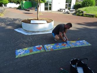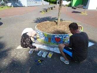 „Die Mosaikbank im Eingangsbereich unserer Schule hat bestimmt den Ausschlag für weitere Ideen rund um die Mosaikkunst gegeben. Denn wenn man sieht, wie gut die neu gestaltete Bank nicht nur genutzt, sondern mit der kunstvollen Gestaltung auch geschätzt wird, dann ist es leicht nachzuvollziehen, dass unsere Schülerinnen und Schüler weitere Projekte dieser Art umsetzen wollen“, so Schulleiterin Annegret Schilling bei der Einweihung eines neu gestalteten Pflanzkübels auf dem Gelände der Johannes-Gutenberg-Schule. Das musste dem Mosaikkünstler Rainer Bechthold aus Greifenthal nicht zweimal gesagt werden. Schon bald darauf entwickelte er zusammen mit Schülerinnen und Schülern der „Mosaik-AG“ das aktuelle Projekt. Zunächst wurden die Ideen skizziert und in kleineren Modellen umgesetzt. Dafür wurden die verschiedenfarbigen und frostfesten Fliesen mit Hammer und Zange zerschlagen und die Motive, welche gemeinsam in mehreren Stunden entworfen wurden, mit den kleinen bildgebenden Teilchen angelegt, denn jedes noch so große Mosaik beginnt mit dem ersten Stein. Die Motive für das Projekt waren schnell gefunden, denn schließlich steht der Pflanzkübel mitten auf dem Schulhof und der darin stehende Baum sollte dadurch eine entsprechende künstlerische Aufwertung erhalten. So lassen sich auch die Abbildungen einer Sonne, einiger Blumen, einer grünen Wiese und eben auch eines Baumes erklären. Mosaikkünstler Rainer Bechthold übertrug nun die Einzelmotive auf ein großes Netz, welches schließlich auf den Pflanzkübel angebracht und verfugt wurde. „Und dass unsere Schule damit ein wenig bunter wird, gefällt mir am meisten. Aber auch das Arbeiten mit den kleinen bunten Teilchen hat mir sehr viel Spaß gemacht, auch wenn es manchmal doch etwas anstrengend war“, so eine Schülerin zufrieden beim Betrachten des Ergebnisses. „Ich freue mich sehr über das zweite, sehr schöne und sehenswerte Ergebnis der Mosaik-AG und ich kann mir gut eine weitere Zusammenarbeit mit Rainer Bechthold vorstellen“, so Ganztagskoordinatorin Silke Riedl. „Denn schließlich bestimmen unsere Schülerinnen und Schüler, wie das freiwillige Angebot am Nachmittag aussieht, da es auf ihre aktive Teilnahme an den Arbeitsgemeinschaften ankommt“, so Riedl abschließend.