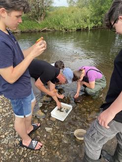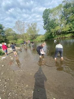 Nun sollten auch die Faktoren Wassermenge und -qualität an der heimischen Dill praxisnah untersucht werden. Dafür ging es bepackt mit Kescher, Wannen, Lupengläser und Bestimmungsliteratur jetzt in Richtung Dill. Dort rüsteten sich die Schüler mit Angler- und Watthosen bzw. mit Badeschuhen aus, um den Fluss näher untersuchen zu können.