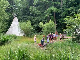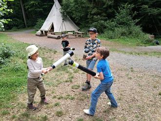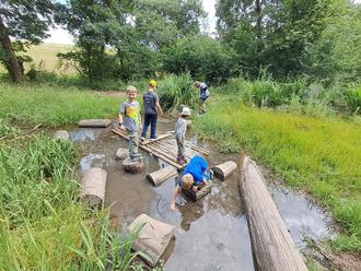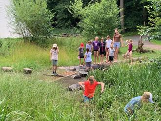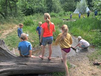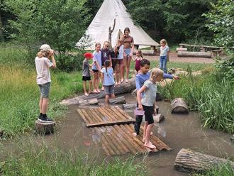 Am nahegelegenen „Tippidorf“ warteten weitere Überraschungen: Ein kleines Bächelchen lud zum Planschen, Matschen und Staudammbauen ein – bei sommerlichen Temperaturen eine willkommene Erfrischung. Mit viel Eifer bauten die Kinder Dämme, leiteten Wasser um und probierten aus, wie sich der Bach verändern lässt.
