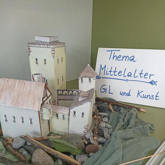 Im Fach Gesellschaftslehre (GL) sieht der Lehrplan am Ende der Klasse 7 das Thema „Mittelalter“ vor. Die Klasse 7b der Johannes-Gutenberg-Schule lernte jetzt einiges in dieser Einheit über die verschiedenen Abschnitte des Mittelalters, über Karl den Großen, das Ständesystem und das Lehenswesen kennen. Dabei ging es vor allem um die Frage, wie das Leben auf einer mittelalterlichen Burg aussah. Wer lebte dort? Wie waren Burgen aufgebaut? Und welche Funktionen hatten sie? In Kooperation zwischen den Fächern Kunst und GL entstanden in dieser Zeit Ritterburgen aus Papier und Karton, die in kleinen Gruppen von zwei bis vier Schülerinnen und Schülern angefertigt und gestaltet wurden. Wehrturm, Bergfried, Ställe, Palas, Kapelle und Innenhof mit Ziehbrunnen – all diese wichtigen Bestandteile einer Burg wurden von den Schülerinnen und Schülern zu Burganlagen zusammengesetzt. Bewundern kann man einige dieser Ergebnisse jetzt in der Glas-Vitrine am Ende der Schulstraße.
