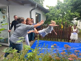 Im Anschluss gingen alle Kinder nochmal durch den Kindergarten und verabschiedeten sich von allen Räumen und wurden dann von ihren Gruppenerziehern und einem lustigen Reim aus der Kita geworfen.
