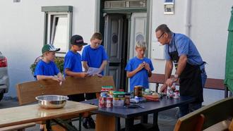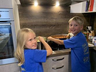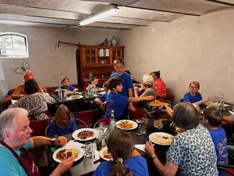 Jede Gruppe gab dabei ihr Bestes. Die Vorbereitungen waren abgeschlossen und jetzt herrschte reger Betrieb in der Küche. Unter Aufsicht wurde in großen Töpfen und Brätern gebrutzelt und gerührt, am Arbeitstisch wurde Sahne geschlagen und die Gemüsesuppe cremig püriert. Vor der Spüle tummelten sich zwischendurch ebenfalls drei bis vier Kinder und Erwachsene, spülten und trockneten ab.