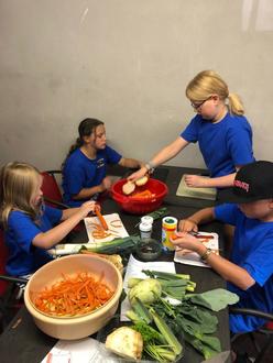 Die Kinder wurden durch Losverfahren in 3 Gruppen für Vorspeise, Hauptspeise und Nachtisch aufgeteilt. Unter der Aufsicht und Mithilfe von Margaret Halwe, Waltraut Ochsmann, Sybille Rumpf, Regina Scharkowski, Gerd Ringsdorf und Achim Scharkowski wurde geschält, geschnippelt, gehackt, gerührt, gewürzt und abgeschmeckt.