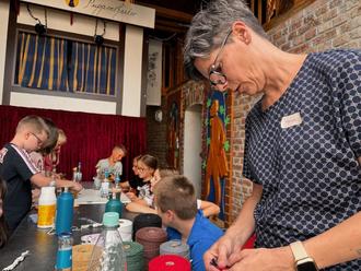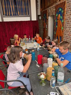 Marlene Vanderlinde und Marianne Weiser übernahmen die Mädchen und Jungen von ihren Eltern in ihre Obhut. In der Scheune war bereits alles vorbereitet und die nötigen Utensilien lagen für die Kinder bereit. Die erwartungsvollen und gut gelaunten Kinder konnten sich nach einer kurzen Einweisung durch Marlene gleich ans Werk machen.