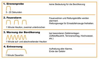 Die Sirenenwarnung beginnt mit der „Warnung der Bevölkerung“, ein auf- und abschwellender Heulton über eine Minute. Zum Abschluss wird das Signal „Entwarnung“ (eine Minute Dauerton) über die Sirenen ausgestrahlt.