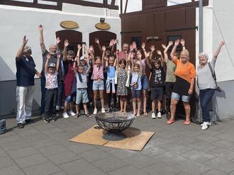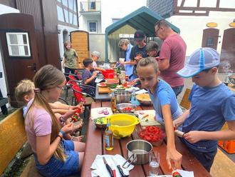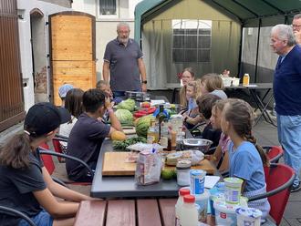 12 interessierter Kinder haben sich für dieses Programm bei den Senioren angemeldet. Der Hof war wieder gerichtet und die Lebensmittel auf dem Tisch ausgebreitet.